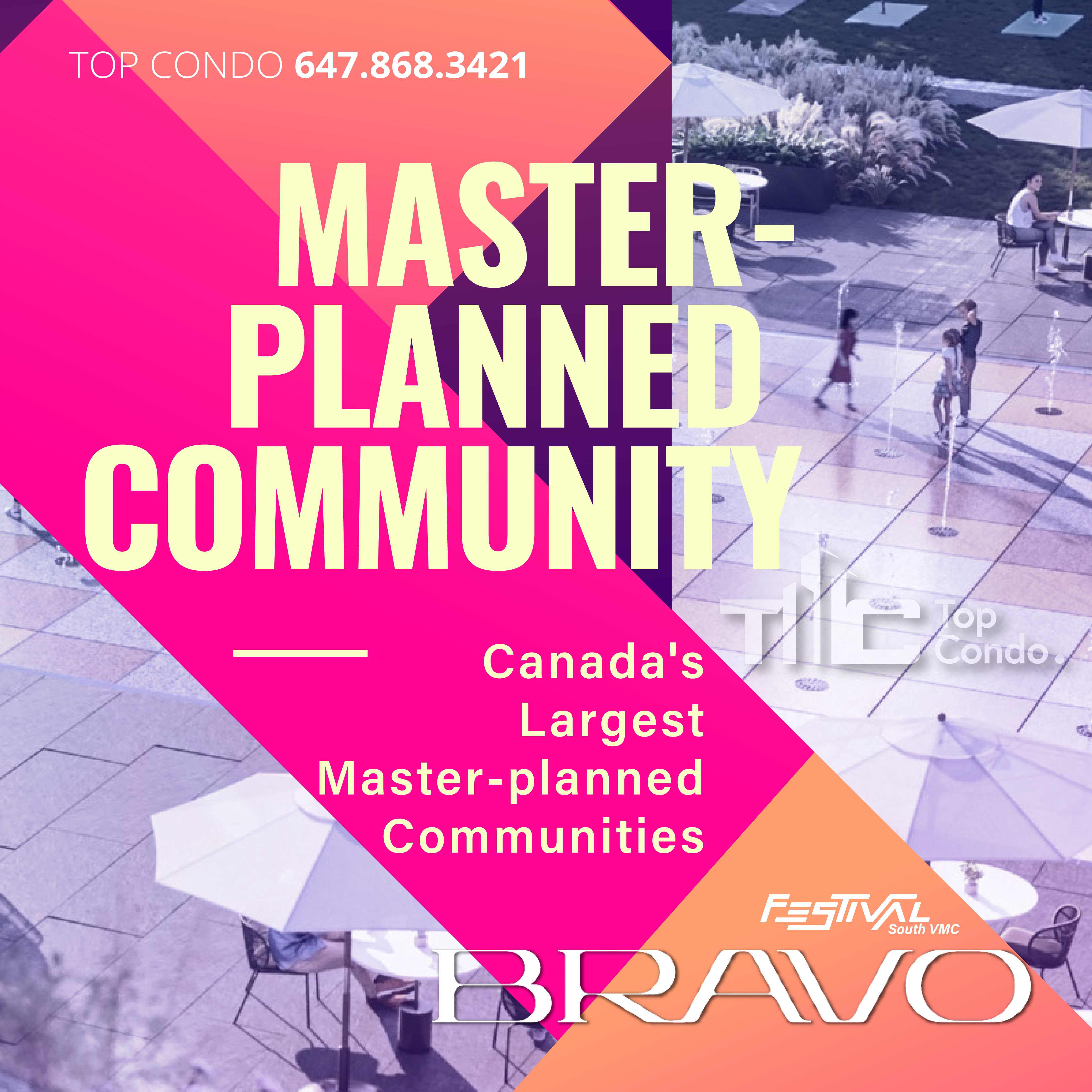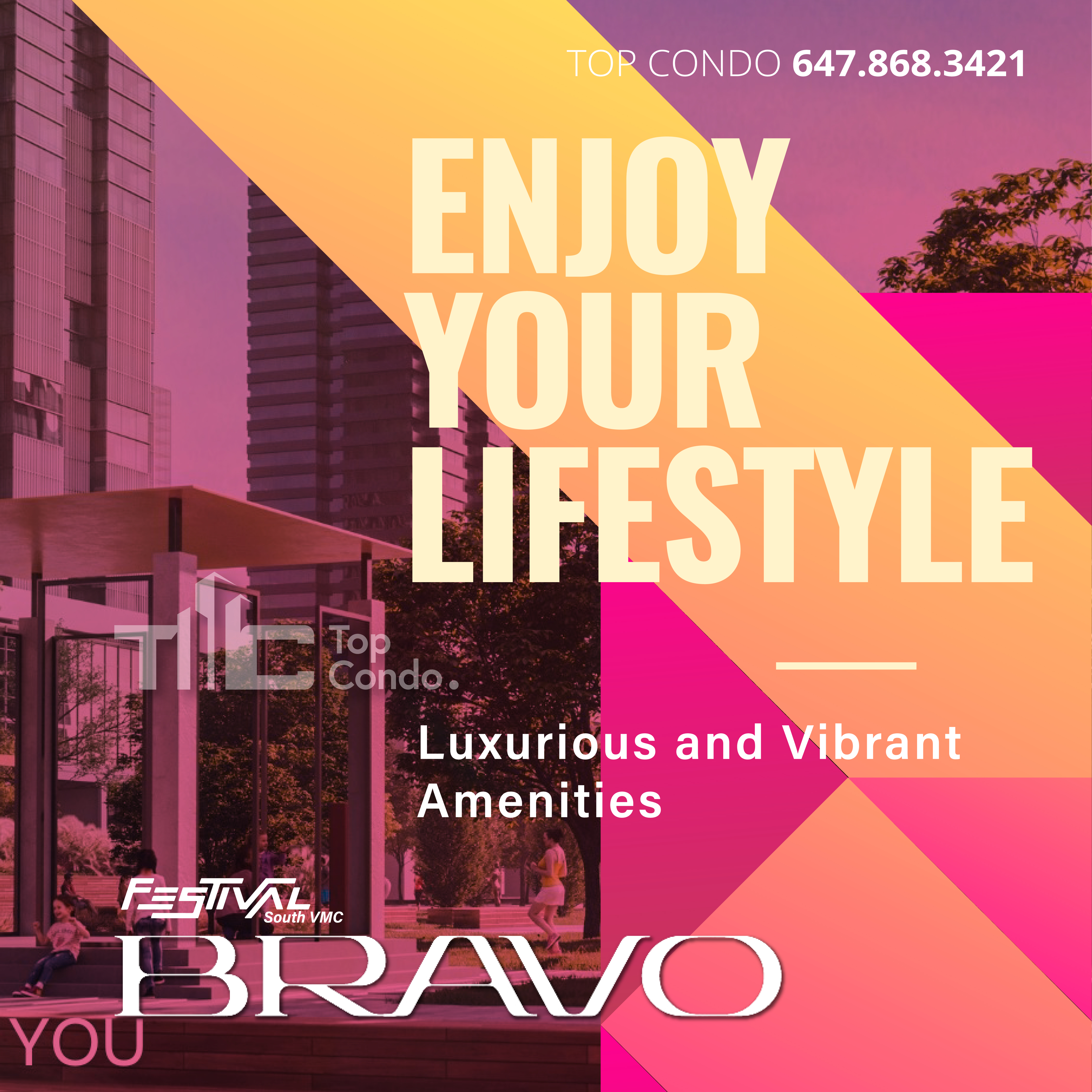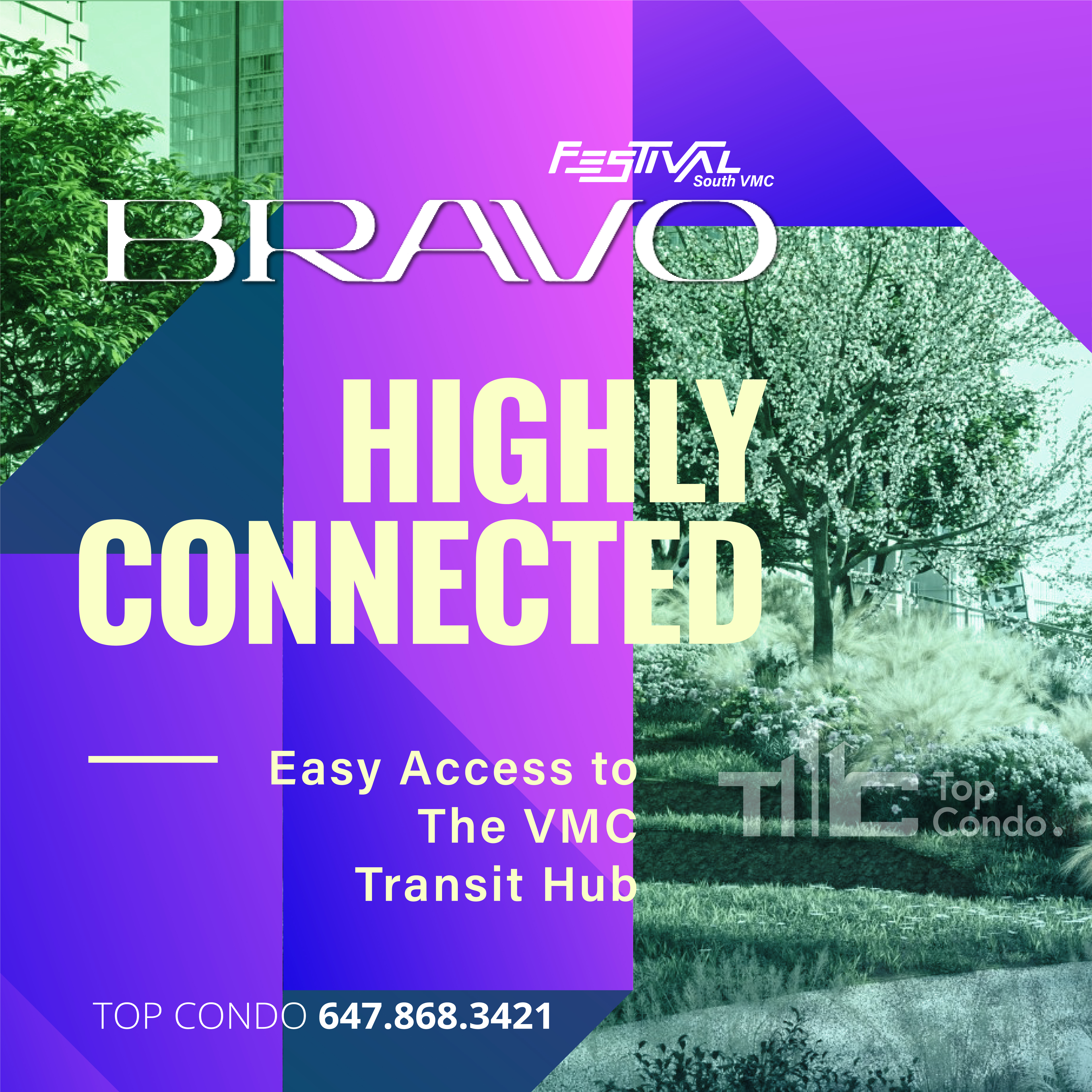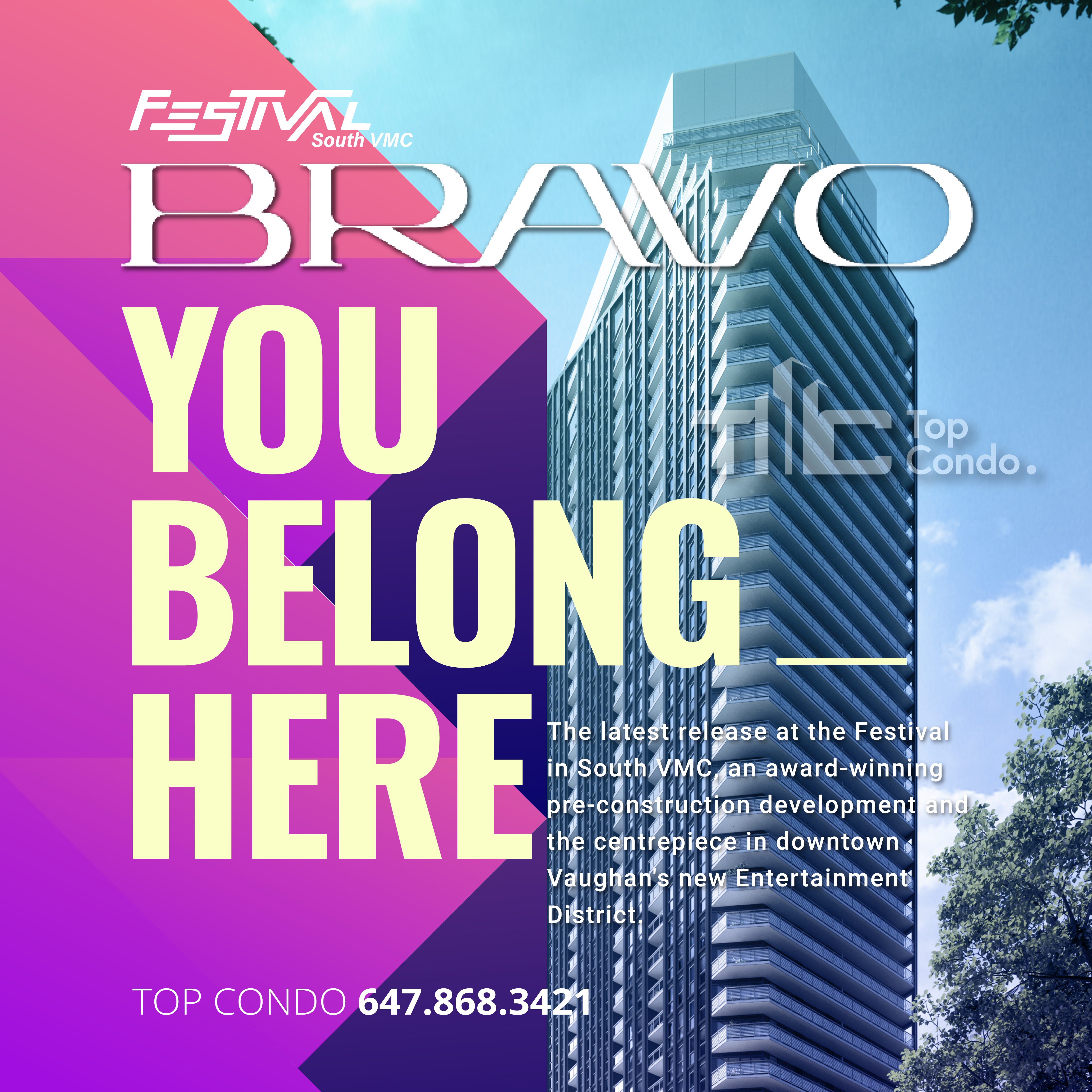 Comprised of 4 condo towers and townhome units, Bravo Condos is the next residential phase at Festival VMC, the country's best-selling condo community and one of Canada's largest master-planned communities. Located in the new heart of downtown Vaughan and just minutes from Vaughan Metropolitan Centre, VMC transit hub, plenty of lifestyle amenities, green living spaces, prestigious schools, employment opportunities, and tree-lined pedestrian promenades, residents here will be able to set down roots, thrive and grow while experiencing something new and different every day.