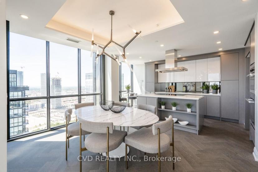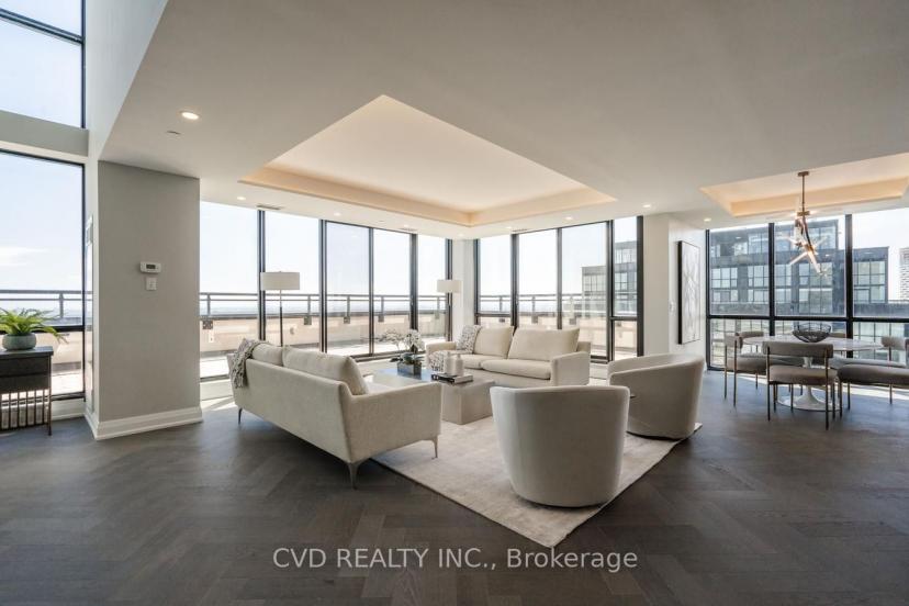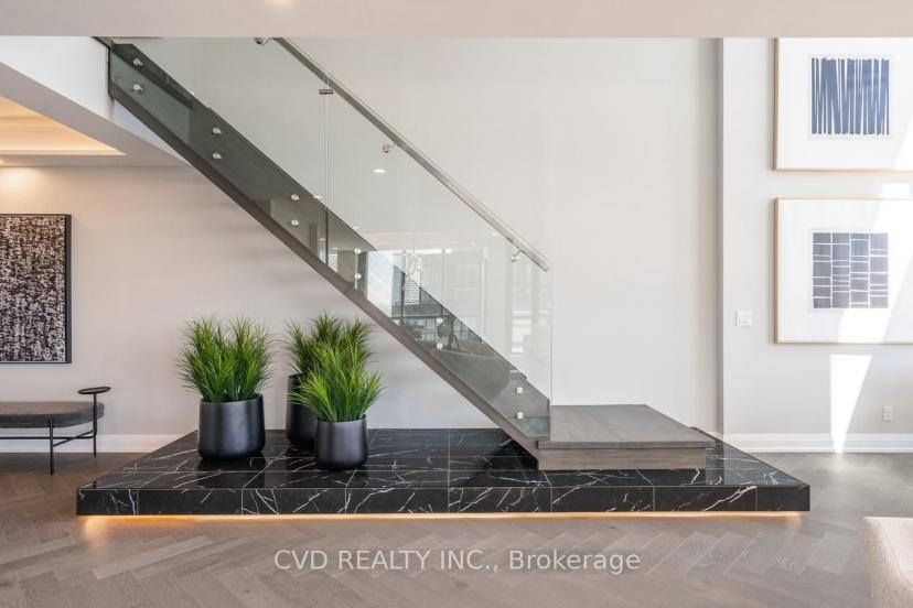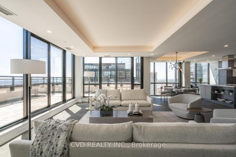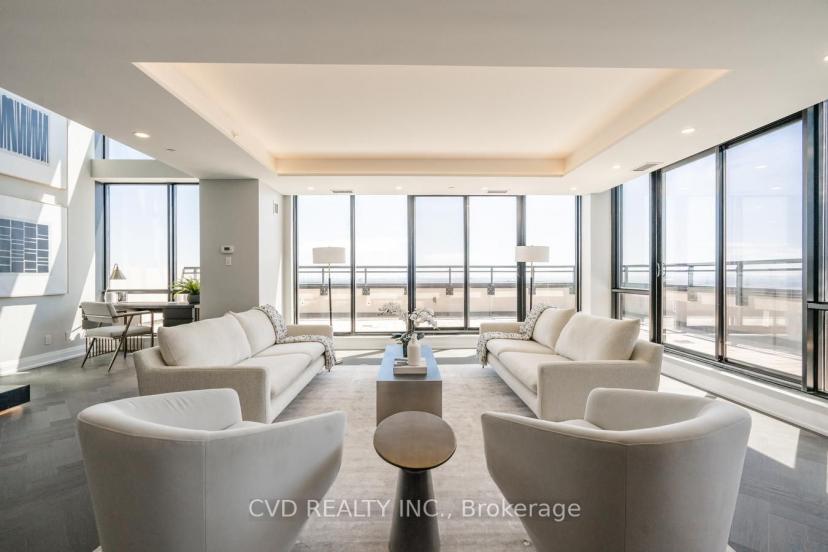 Absolutely Stunning One Of A Kind State-Of-The-Art Penthouse Corner Loft Suite. 2119 Sq. Ft Of Luxury Living Space Including 257 Sq. Ft Terrace. Breathtaking views of Toronto, GTA + Vaughan. Engineered Hardwood Floors (Herringbone Pattern), Quartz Countertops, Potlights & Smooth Ceilings Throughout. Built in Appliances, walk in Wine Cellar, 14' Ceilings, floating glass railing staircase to loft area featuring 2 spacious bedrooms. Floor To Ceiling Windows, Large Terrace With Bbq Connection. 2 full luxurious Bathrooms + guest washroom. Laundry Room, Custom Built in Closets + more! located in a high demand city center amongst fine dining luxurious shopping, subway, building features Pool, sauna, 24 hr concierge / security, event room, billiards room, theatre and more! All existing appliances, electric window coverings with remote, 2 private underground parking spaces with (2) adjacent walk in storage locker rooms in each parking. Building features the finest amenities. Pool, 24 hr concierge.